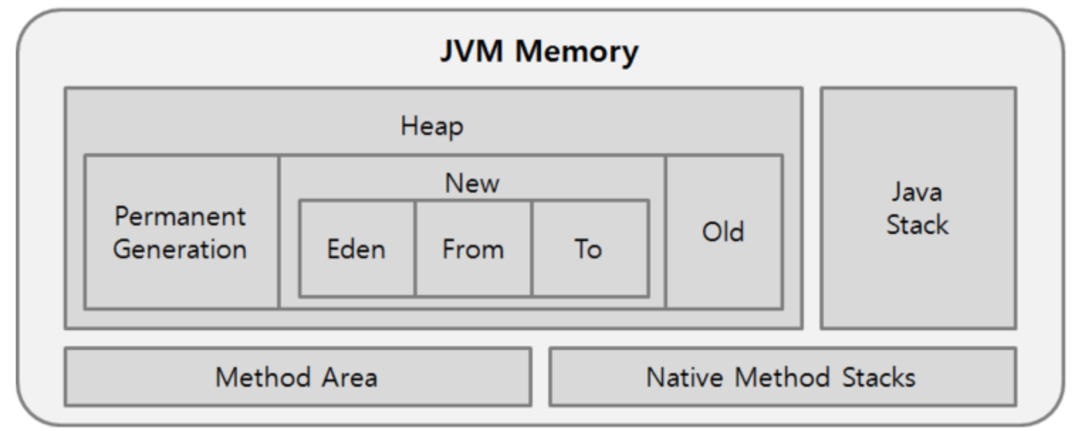 1) New(Young Generation) : 생성된지 얼마 안된 객체들이 저장되는 장소이며,