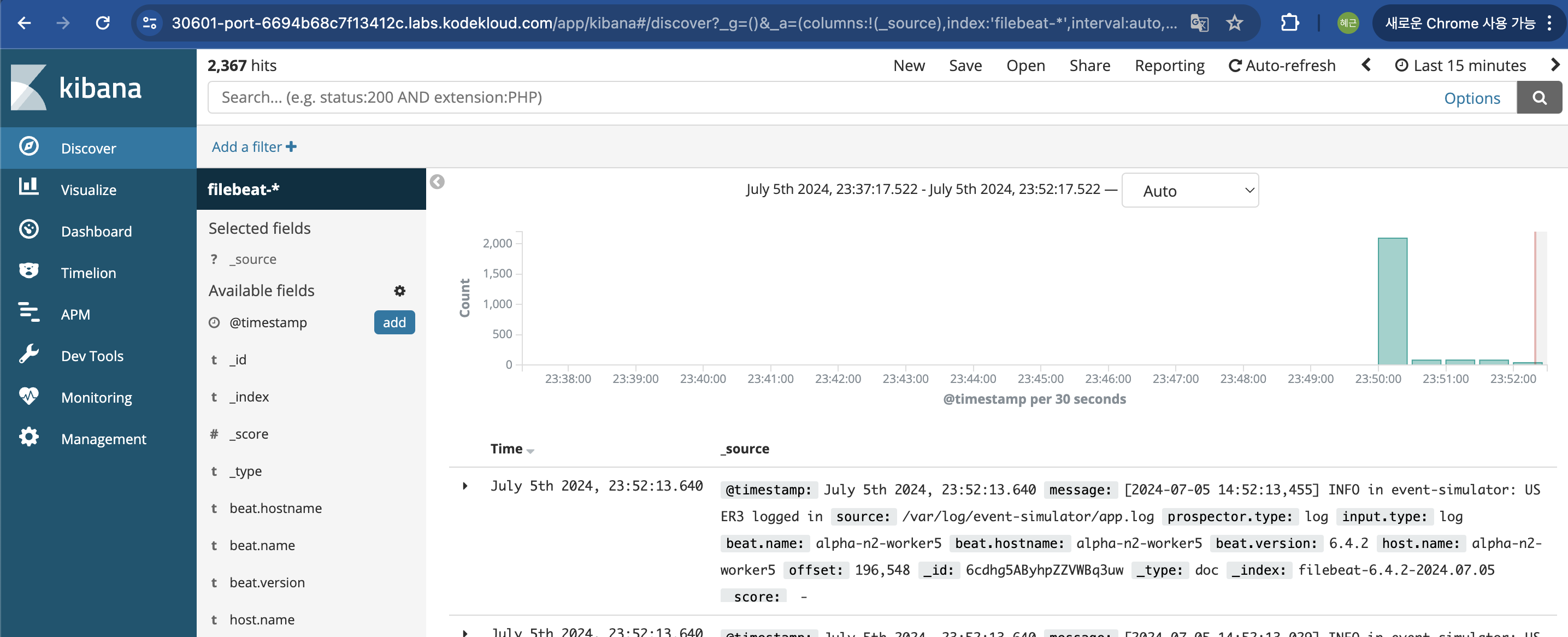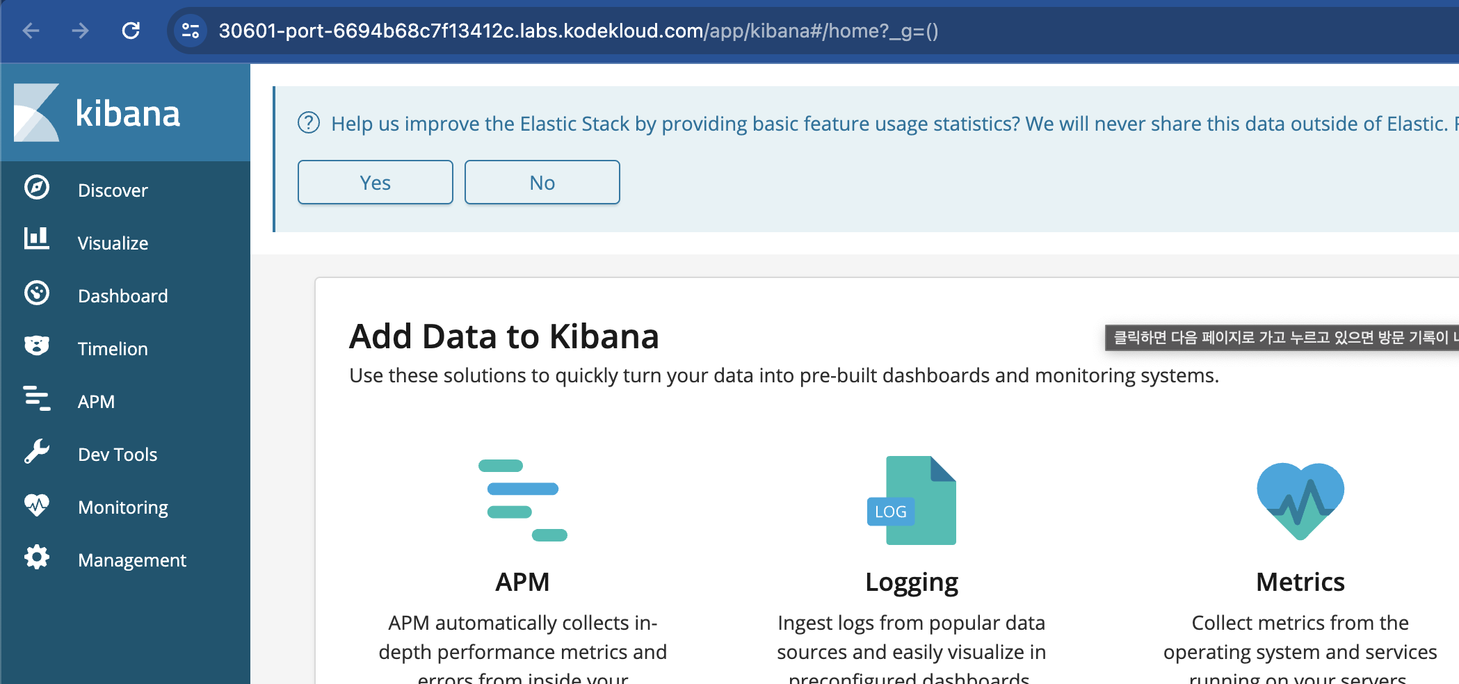 5. Once the pod is in a ready state, inspect the Kibana UI using the link above your terminal. There shouldn't be any logs for now.
